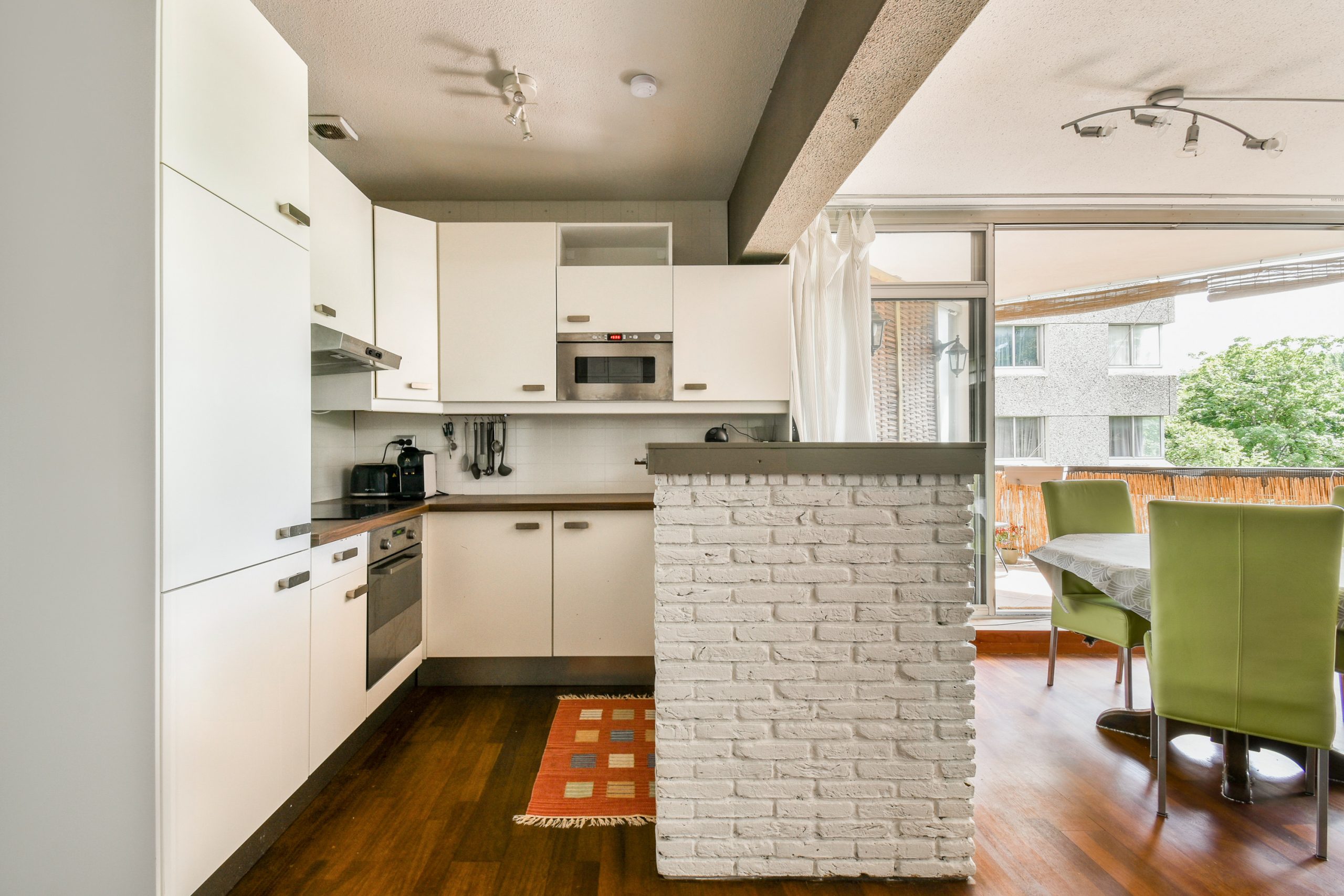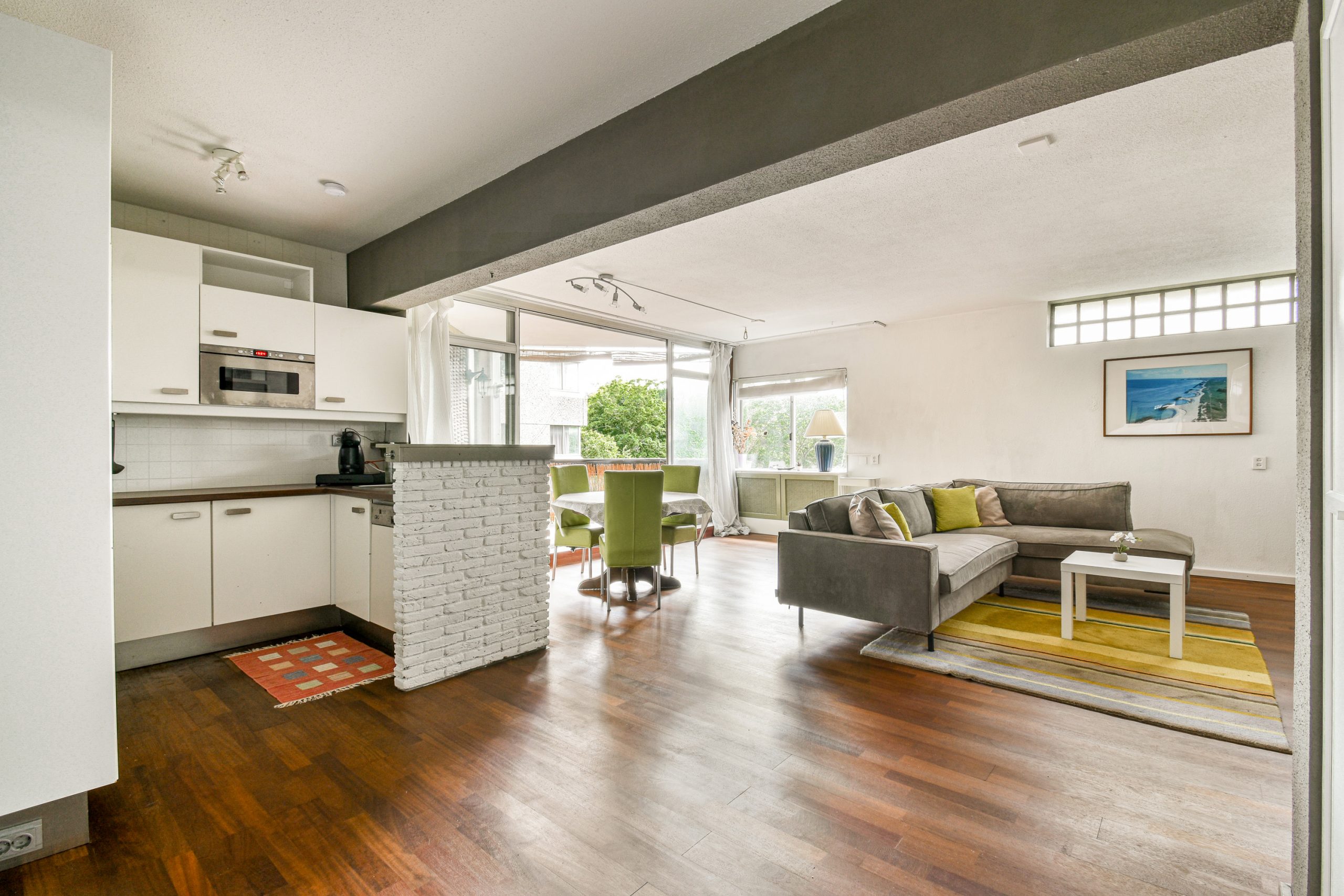 Het appartement beschikt over vier kamers, waaronder drie ruime slaapkamers. De lichte woonkamer is voorzien van grote ramen, wat zorgt voor veel natuurlijk daglicht en een open sfeer. De keuken is modern en compleet uitgerust met volledige inbouwapparatuur. De praktische indeling maakt dit appartement ideaal voor zowel gezinnen als werkenden aan huis.