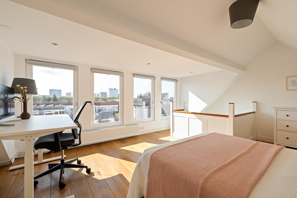 De bovenste verdieping, met een dakkapel over de volledige breedte, biedt een prachtig uitzicht over Amsterdam. Deze verdieping is voorzien van ingebouwde kasten voor optimaal opbergruimte en een apart toilet. Deze verdieping biedt veel mogelijkheden voor verschillende gebruiksdoelen.
