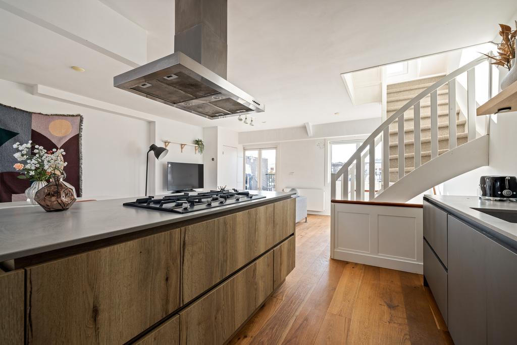 De vierde verdieping herbergt een lichte en ruime woonkamer met grote ramen die zorgen voor veel natuurlijk licht. De moderne, volledig uitgeruste keuken is voorzien van hoogwaardige inbouwapparatuur. Vanuit de woonkamer stap je het riante terras op, perfect om te ontspannen en te genieten van de zon.