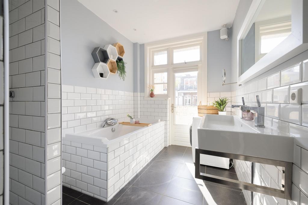 Bij binnenkomst op de derde verdieping word je verwelkomd door een centrale hal met een stijlvolle houten vloer. Hier bevinden zich twee ruime slaapkamers, waarvan één toegang biedt tot een extra kamer die kan dienen als inloopkast, sneakerroom of kinderkamer. De moderne badkamer op deze verdieping is uitgerust met een douche, ligbad, dubbele wastafel en een wasmachine-aansluiting. Ook heb je toegang tot een klein balkon aan de achterzijde. Een apart toilet is eveneens aanwezig.