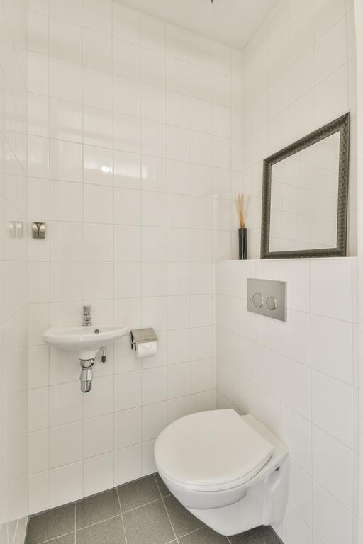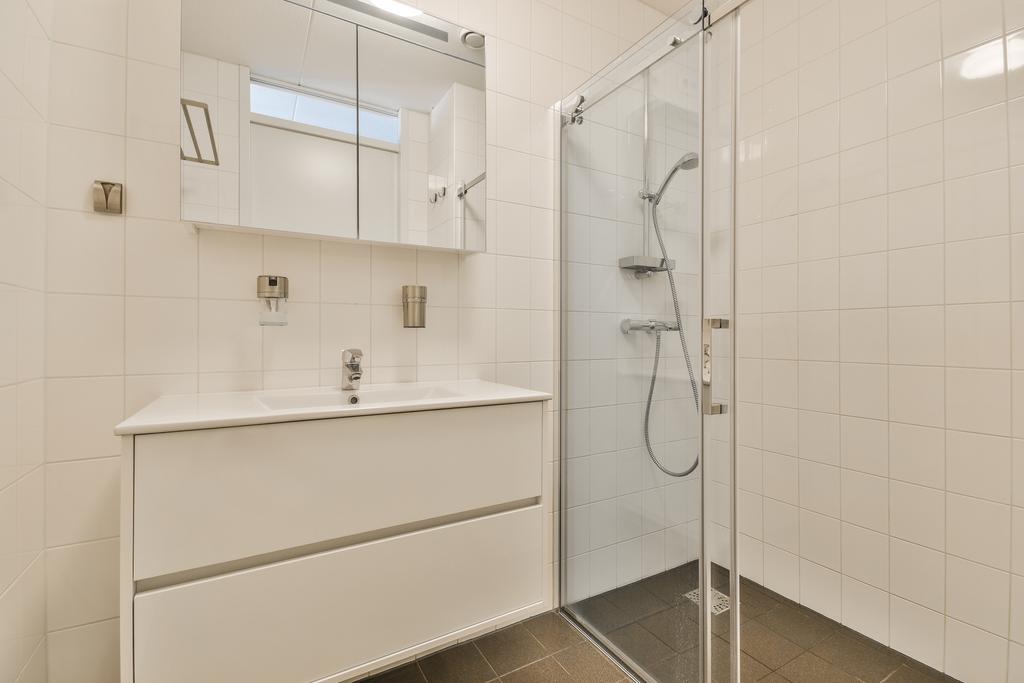 De moderne badkamer is volledig betegeld en voorzien van een comfortabele douche en stijlvol wastafelmeubel. Het separate toilet is uitgevoerd in dezelfde luxe stijl. Daarnaast beschikt de woning over een praktische interne berging met wasmachine, droger en vrieskast.