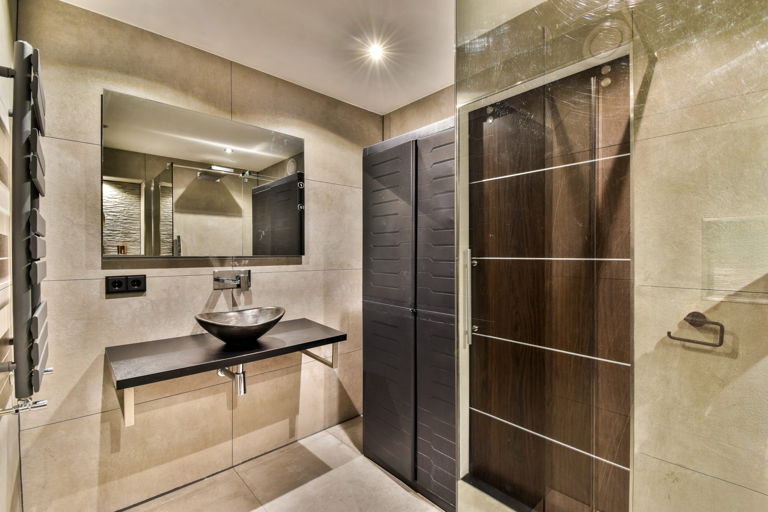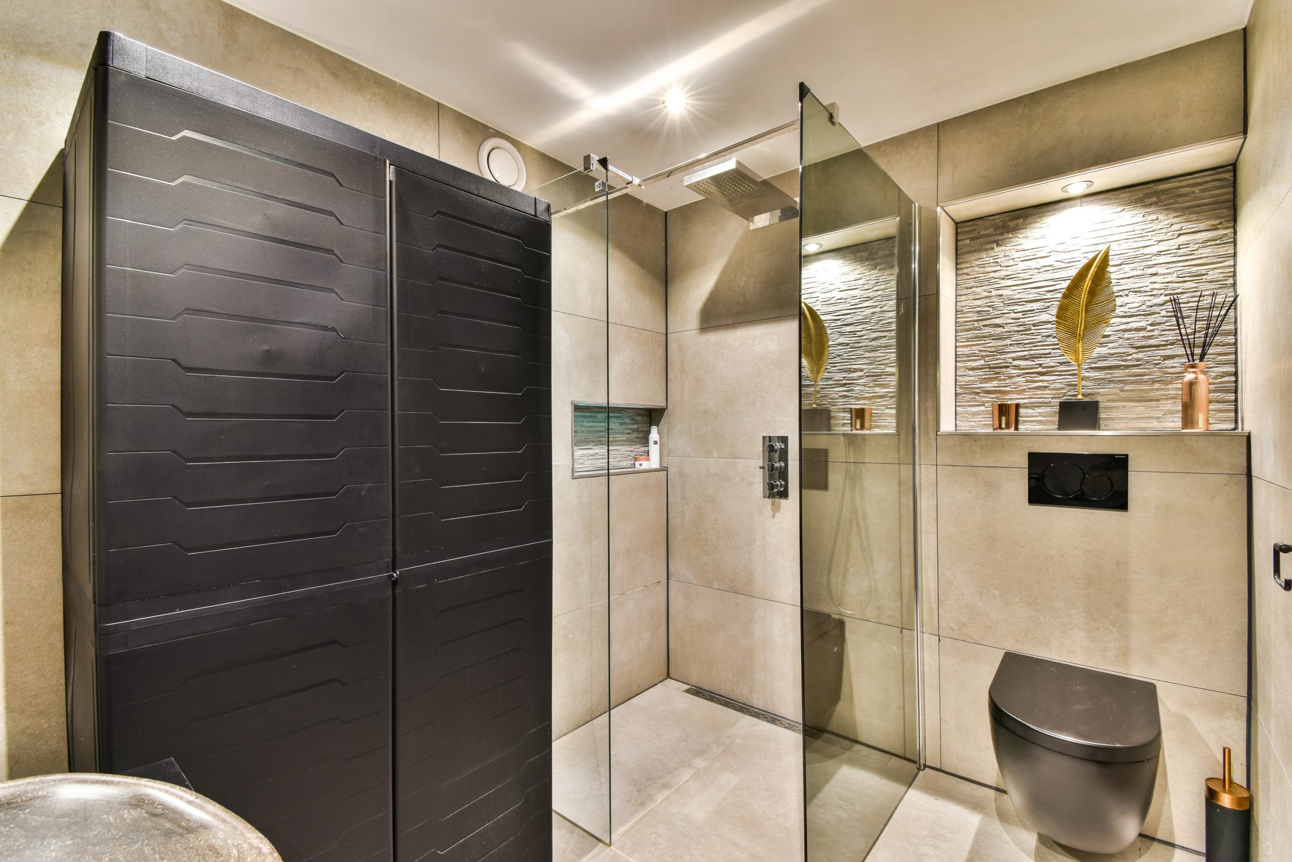 De moderne badkamer is fraai betegeld met antracietkleurige wand en vloertegels. Deze is voorzien van een ruime inloopdouche met glazen wand, een toilet, een stijlvol wastafelmeubel met opberglades en een spiegel met geïntegreerde verlichting.